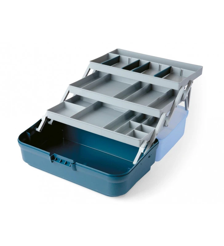 Questa valigetta da pesca è dotata di un interno a 3 ripiani con 16 scompartimenti per riporre la propria minuteria da pesca, ampio spazio sul fondo.