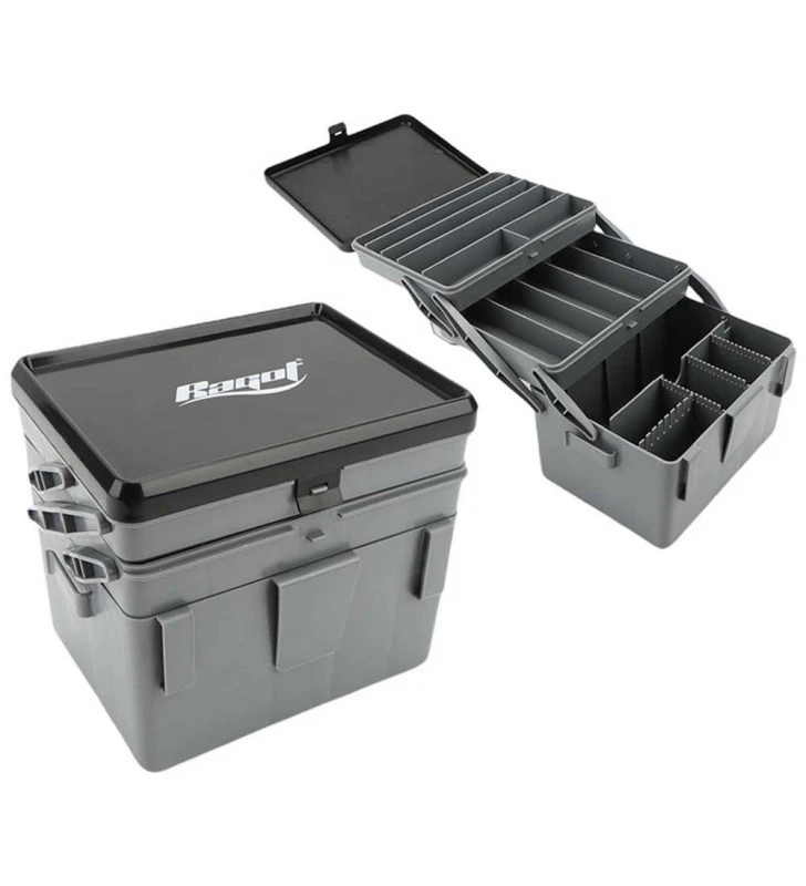 Scatola con diversi vassoi e scomparti, può essere posizionata sulla cintura e ha un supporto per evitare che si ribalti.