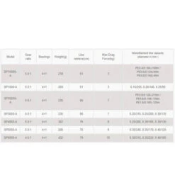 | Modello | Peso | Rapporto di Recupero | Capacità trecciato | Filo recuperato per giro di manovella | Max drag |